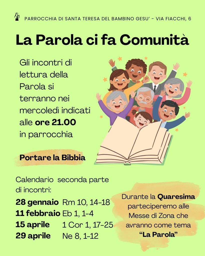A partire da Mercoledì 12 Novembre 2025 riprenderanno gli incontri di lettura della Parola alle ore 21:00 in parrocchia con cadenza calendarizzata. Per tutte le informazioni vedi la locandina qui sotto.